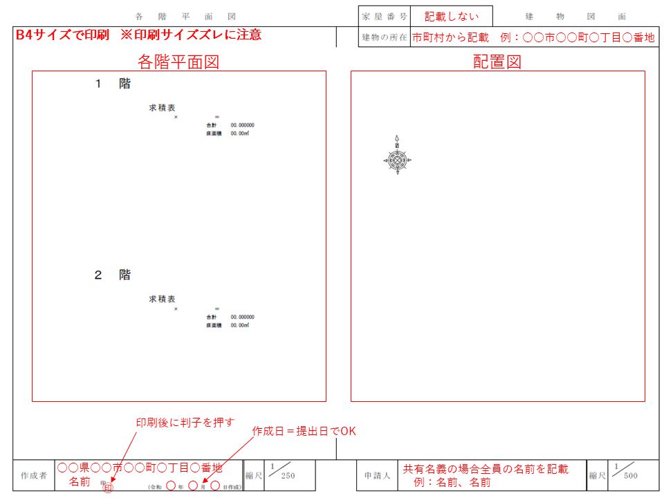 様式については、インターネット上で「表題登記 図面 様式」と検索すれば配布されている方がおられるため、そちらをご利用ください。