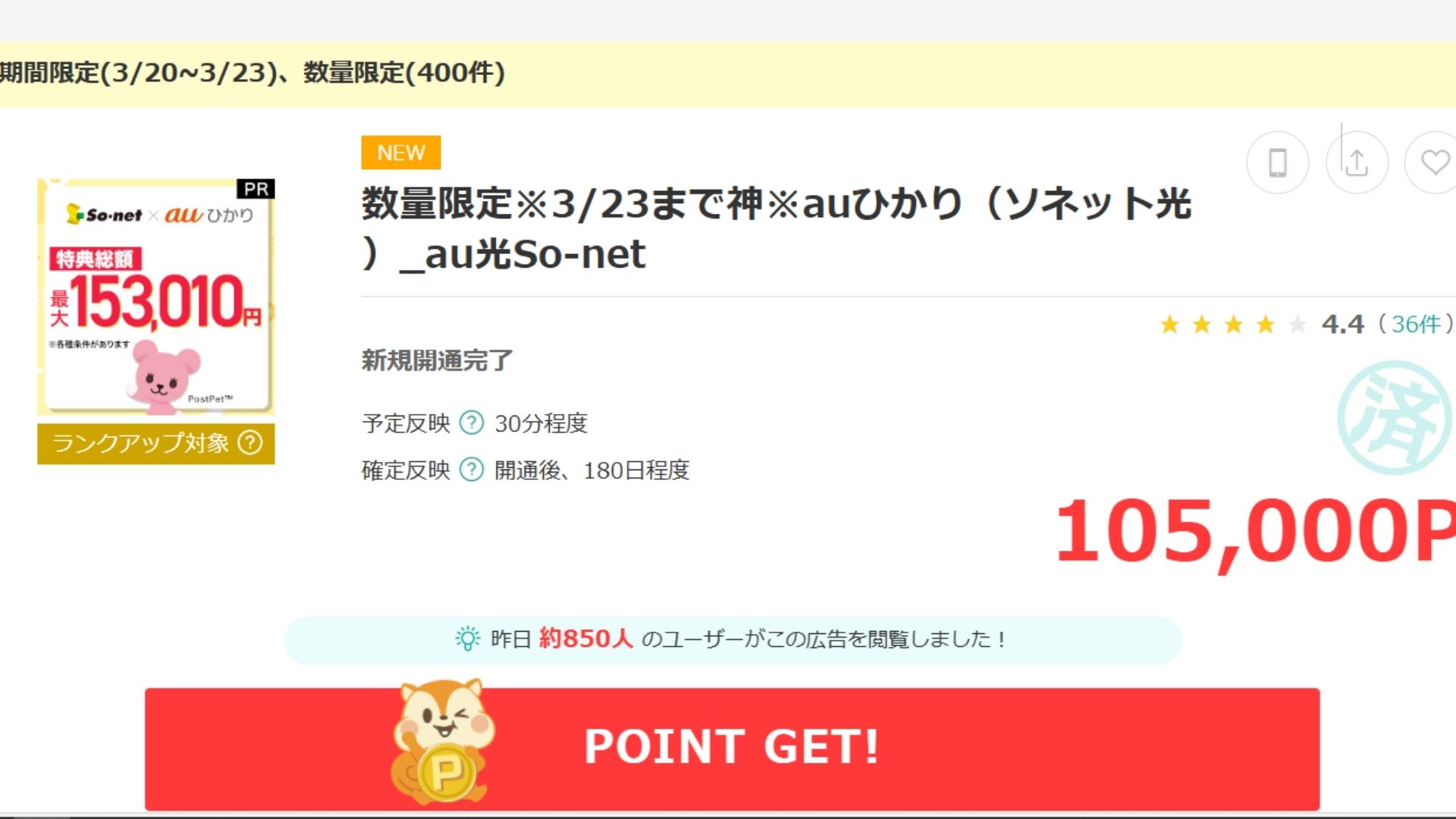 モッピー 数量限定※3/23まで神※auひかり(ソネット光 )_au光So-net