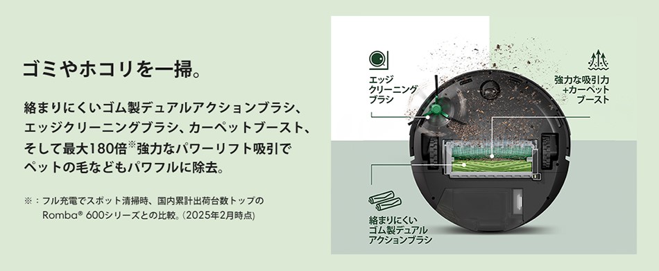 過去のモデルでは、吸引力が強化される機種は上位モデルに限られていましたが、2025年春にフルリニューアルした新モデルでは、廉価モデルでも十分な吸引性能があり、最上位モデルのRoomba Max 705+ は過去モデルと比較して最大180倍の吸引力を実現しており、カーペットやペットの毛、細かなホコリまでしっかりと吸い取ることができます。