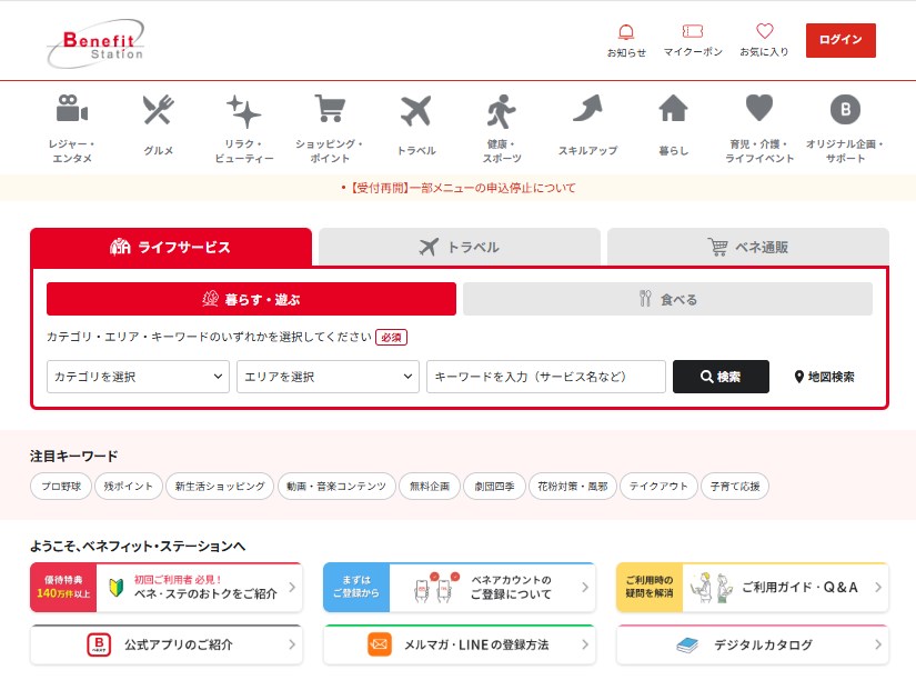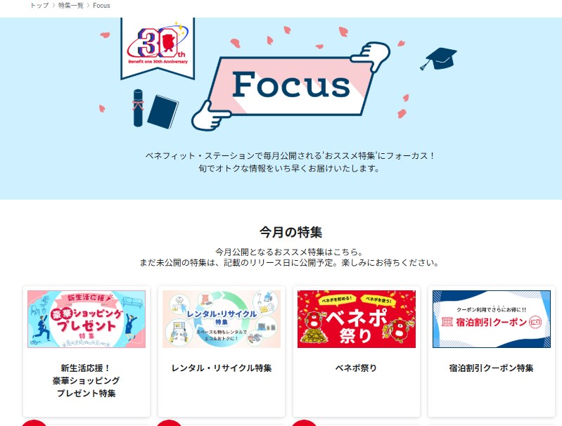 ベネフィット・ステーションには、運営サイドが今お得でオススメだよっとまとめられているページが実はあります。普段検索するページだけでは見つけれませんが、ここを経由することによってお得なサービスを見つけることができます